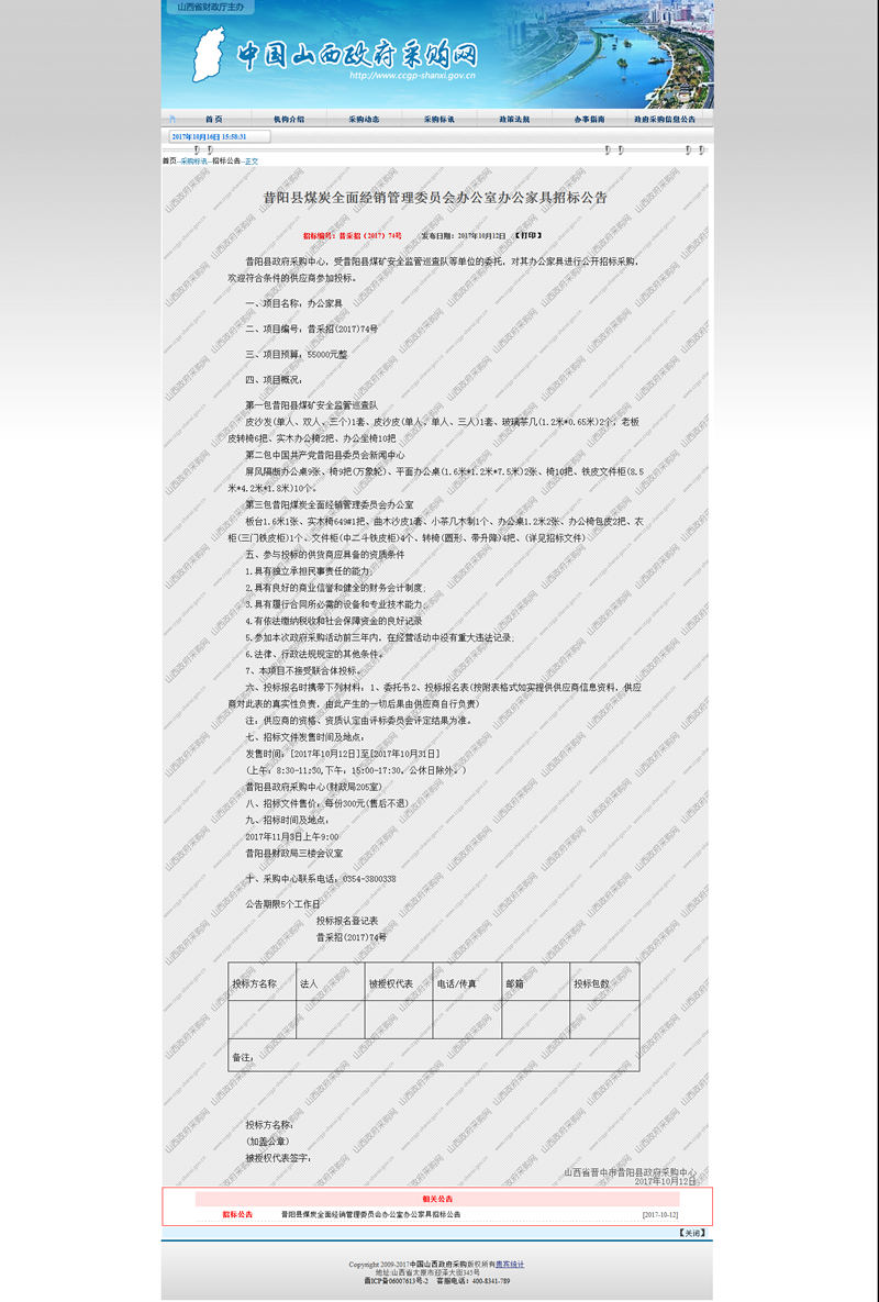昔阳县煤炭全面经销管理委员会办公室办公家具招标公告