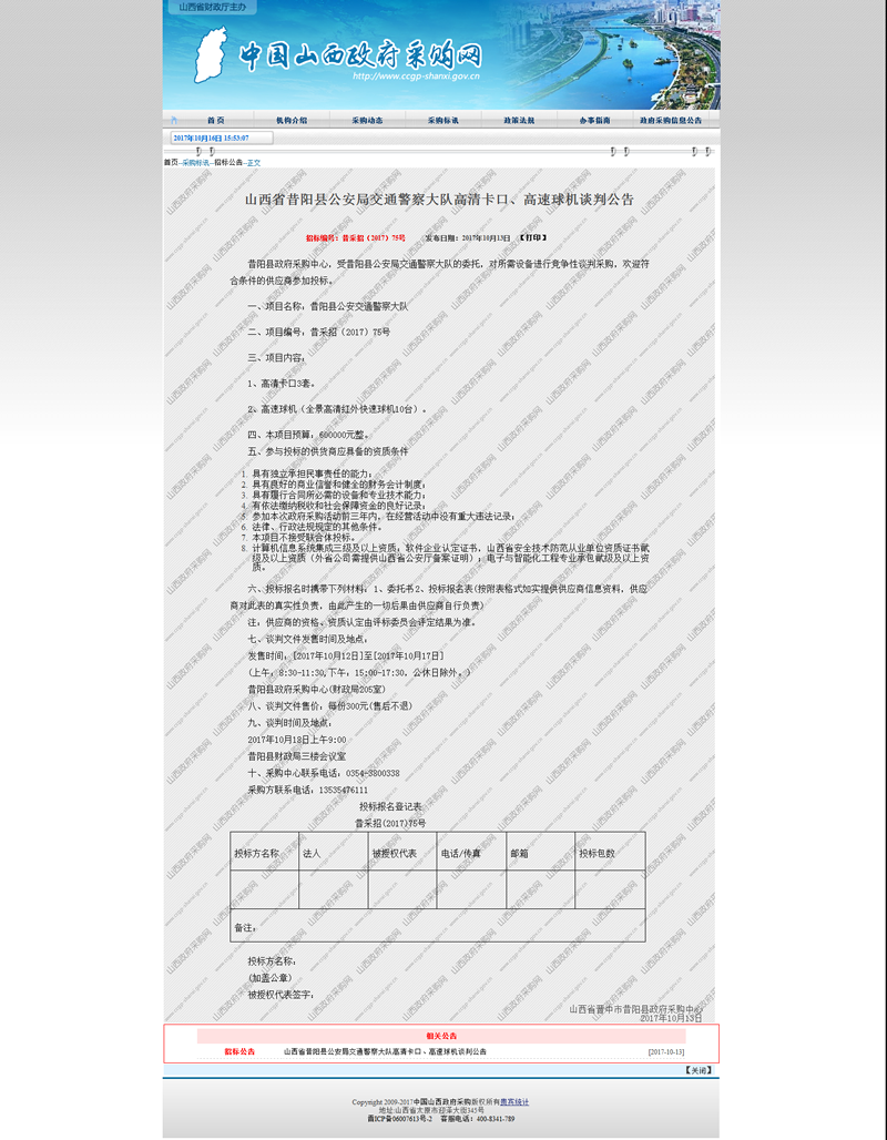 山西省昔阳县公安局交通警察大队高清卡口、高速球机谈判公告